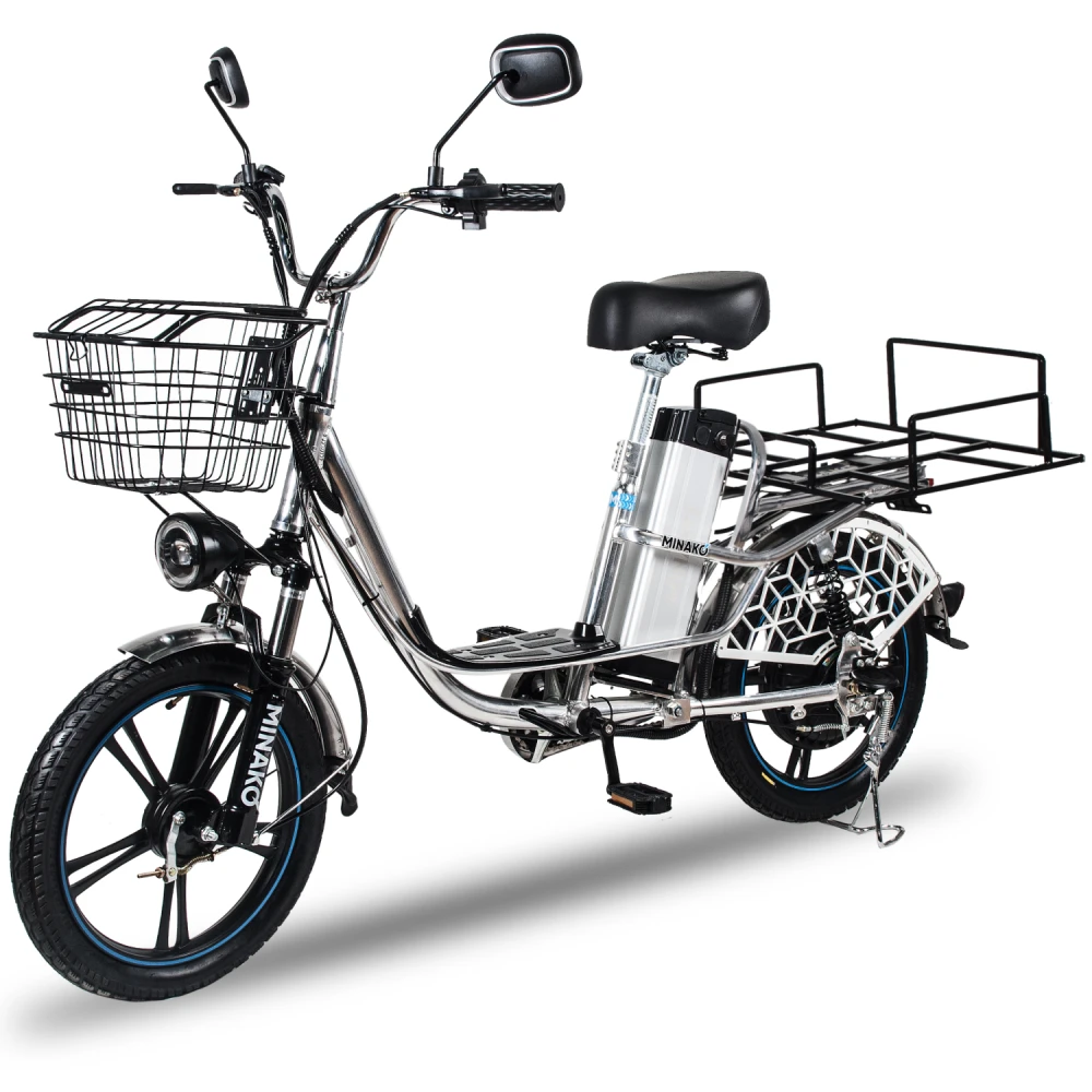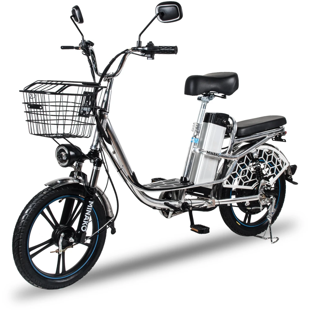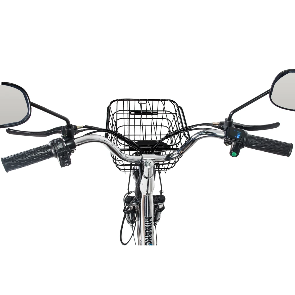 Немаловажным достоинством велогибрида Minako V8 Pro является его комплектация. Здесь, в отличие от других брендов, велосипед сразу поставляется с зеркалами заднего вида, подножкой, корзинкой и багажником для перевозки различных вещей.
