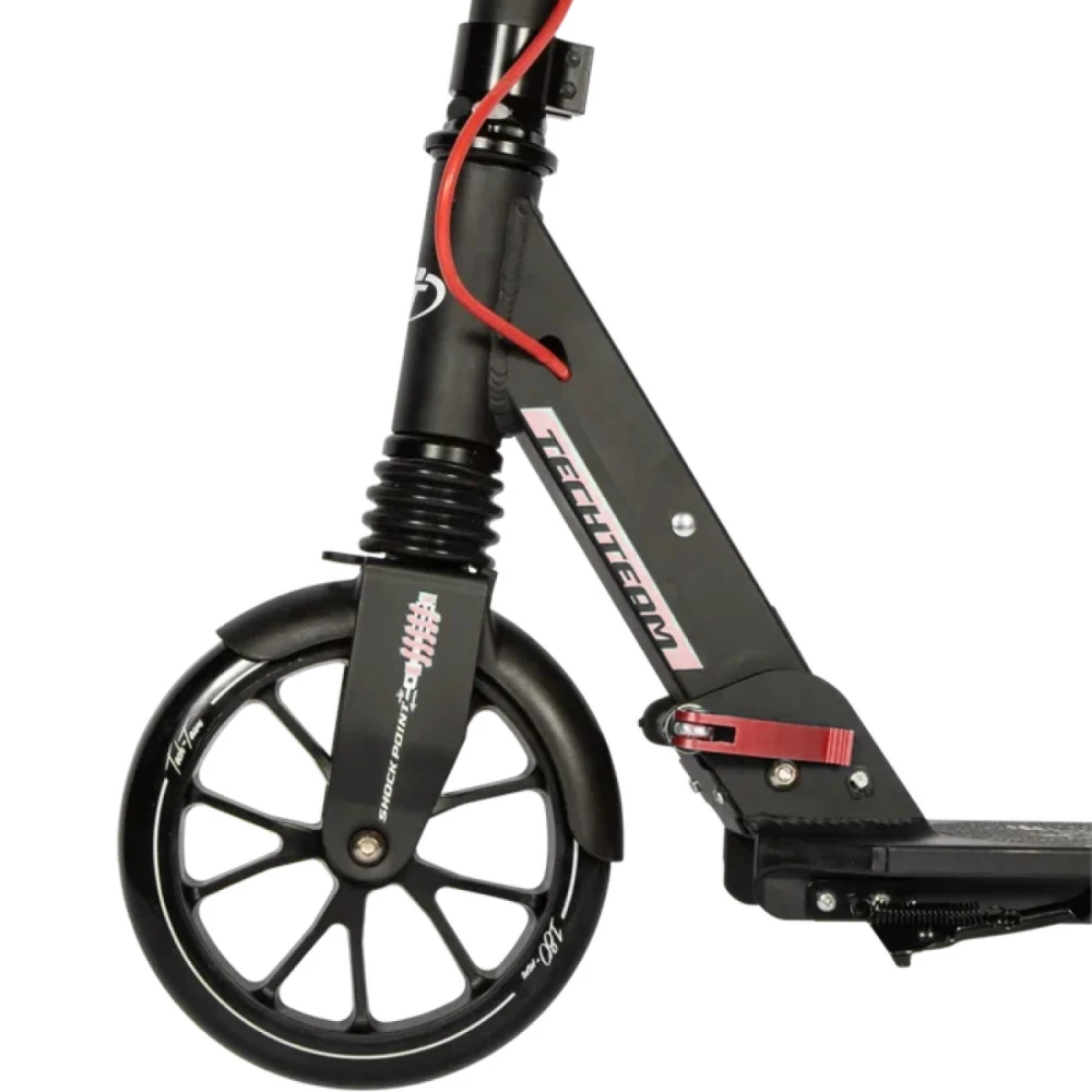 Удобная рулевая часть регулируется в трёх положениях - 750-820-890 мм, имеет широкий зажим, благодаря которому исключается люфт, являющийся главным источником посторонних шумов. Колесная часть – полиуретановая, мало стираемая, размерами 180 мм с подшипниками ABEC 7 Chrome. В сочетании с брендовой тормозной системой гарантирует безопасность, своевременность остановки и массу приятных впечатлений.