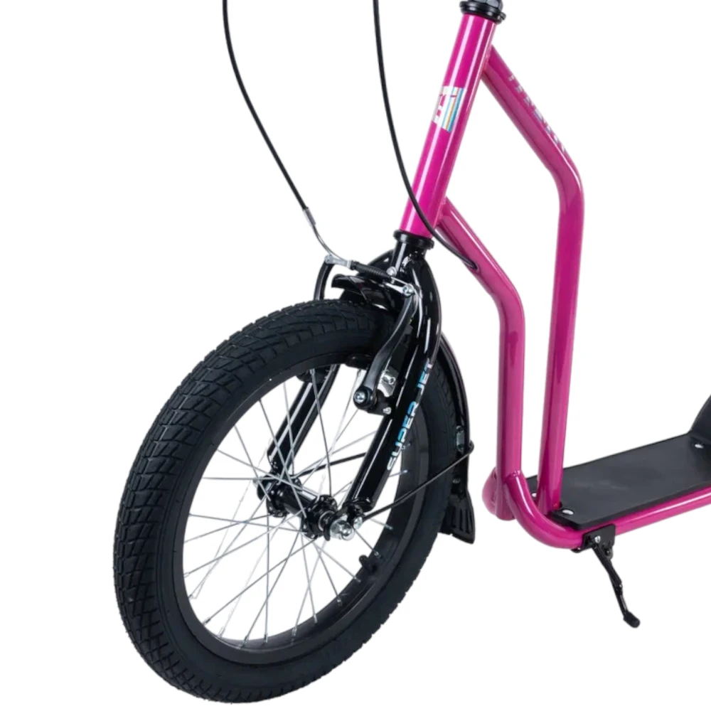Tech Team Super Jet 700 2024 года в ярком розовом цвете - это городской самокат с уникальным дизайном, напоминающим велосипед. Большое переднее колесо диаметром 406 мм и заднее колесо диаметром 305 мм обеспечивают отличную устойчивость и комфорт при езде. Ободные тормоза и велосипедный руль с двумя ручками тормоза обеспечивают надежное торможение и удобное управление. Максимальная нагрузка до 100 кг позволяет использовать самокат людям разного веса. Рама из алюминия делает самокат легким и прочным, его вес составляет всего 8,1 кг. Этот самокат идеально подходит для активных городских поездок.